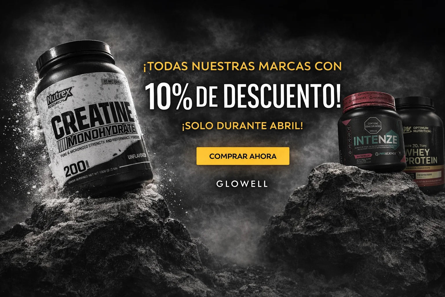Glowell es la tienda online de suplementos deportivos originales en Colombia. Compra proteína whey, creatina monohidratada, pre-entrenos, EAAs, quemadores de grasa y ganadores de peso. Marcas como Optimum Nutrition, MuscleTech, Dymatize, Cellucor C4, Megaplex, Proscience y Vitanas. Envío rápido a Bogotá, Medellín, Cali y toda Colombia.