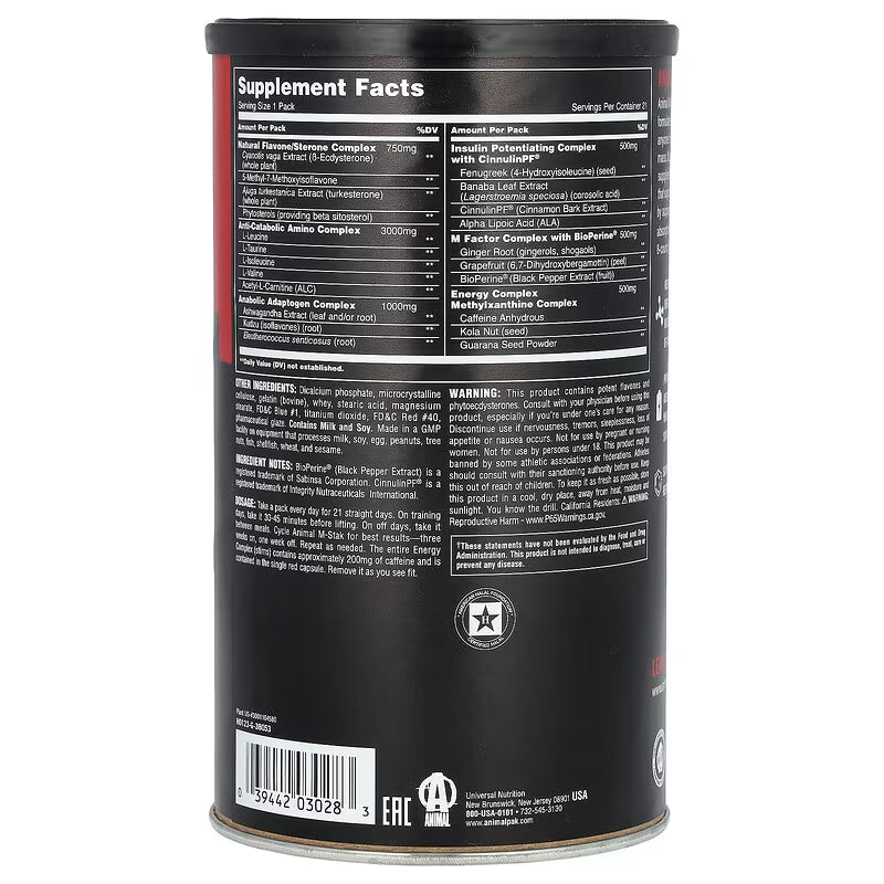 Animal MStak combina una multitud de componentes seleccionados por sus beneficios durante el ejercicio intenso. Una "combinación" se refiere a la concentración en una sola fórmula de diferentes elementos que intervienen en numerosos procesos. Por lo tanto, Animal MStak tiene una fórmula potente, ideal para culturistas o atletas experimentados. Animal MStak no contiene hormonas.