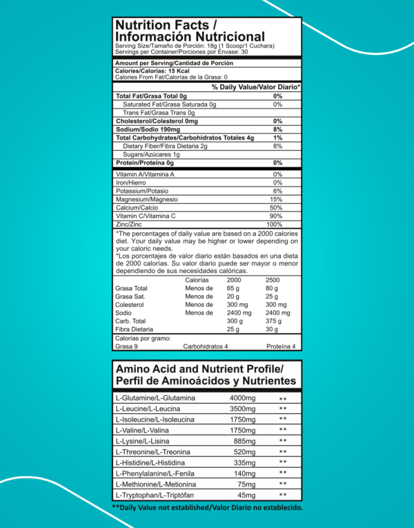 Ingredientes:Polvo Deshidratado de Frutos Amarillos, L-Glutamina, L-Leucina, L-Isoleucina, L-Valina, L-Lisina, L-Treonina, L-Histidina, L-Fenilalanina, L-Metionina, L-Triptófano, Carboximetilcelulosa (CMC),Fosfato Tricálcico, Saborizante idéntico al Natural, Vitamina C (Ácido Ascórbico), Stevia,Citrato de Sodio, Citrato de Potasio, Ácido Málico, Dióxido de Silicio, Colorante (Amarillo), Citrato de Magnesio, Gluconato de Zinc.