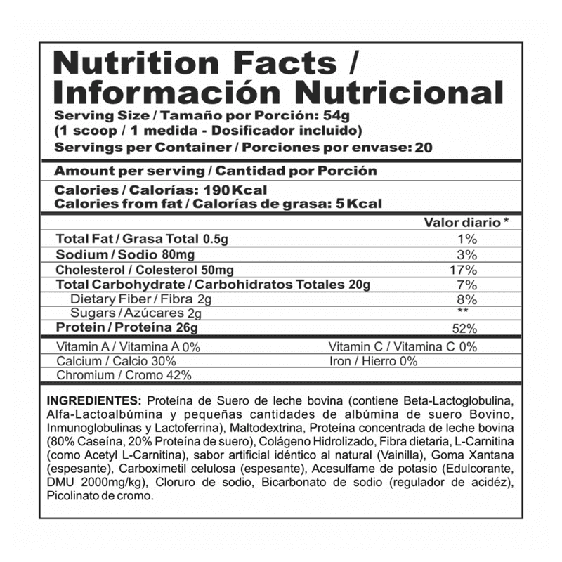Bi-Pro Lite es una fórmula nutricional elaborada a base de proteína de suero y caseína, proteínas lácteas con excelentes perfiles nutricionales y diferentes velocidades de absorción, contiene en su fórmula 1.000 mg L-Carnitina, 400 mcg Picolinato de cromo y 5000 mg de colágeno hidrolizado, en las proporciones adecuadas, aporta 26 gramos de proteína por servicio.