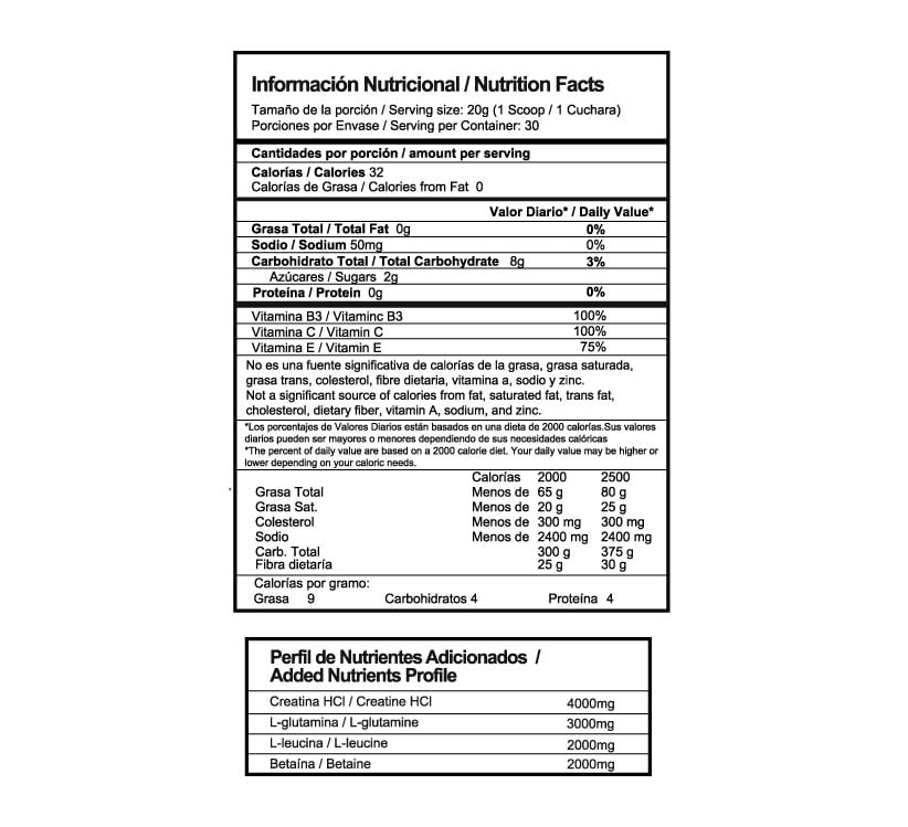 También su fórmula contiene 2 gramos de Betina, la responsable de reducir la sensación de fatiga muscular, permitiendo mejores entrenos; por último 3 gramos de glutamina, el aminoácido mas abundante en el músculo esquelético, ayudando a la recuperación y mejorando la salud intestinal de manera eficiente.