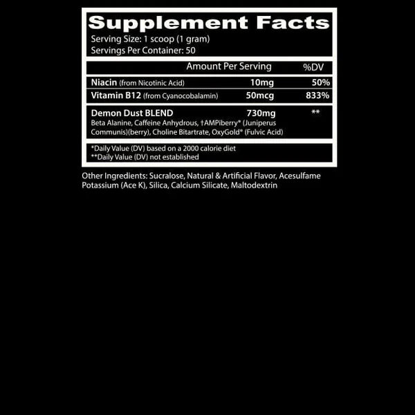 - ENERGÍA INSANE - Demon Dust es una fórmula llena de energía que contiene AMPiberry®, un potente ingrediente diurético que ayuda a mantener la energía y suavizar la curva energética, cafeína anhidra para obtener energía y beta-alanina para aumentar la resistencia. Esta fórmula, mejorada con OxyGold, te garantiza un impulso de energía cuando más lo necesitas.
