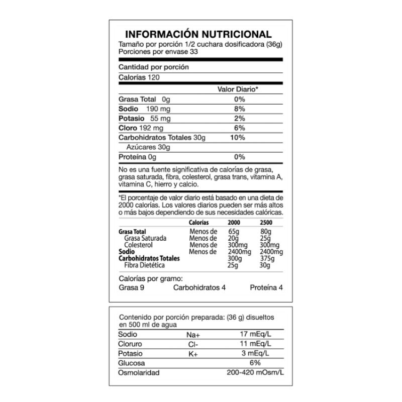 Empaque: Envase plástico con cierre hermético. Contenido: Contenido Neto por empaque 1.200 g (2.6 lbs). Porciones: Rinde para preparar 33 porciones de 500 ml (1/2Litro). Contenido por porción: Cada porción de 36 g mezclado en 500 ml de agua aportan 30 g. Carbohidratos / 120 Calorías / 55 Miligramos de Potasio / 190 Miligramos Sodio / 192. miligramos de Cloro. MODO DE PREPARACIÓN: Mezcle 1/2 cuchara dosificadora (36 g) en 500 ml (1/2 litro) de agua bien fría y agite vigorosamente hasta disolver por completo. RECOMENDACIONES: Para mejor la conservación del producto mantenga bien cerrada la bolsa. Mantener en un lugar fresco y seco. Consúmalo bien frío. Tómese antes, durante y después del ejercicio o actividad física.
