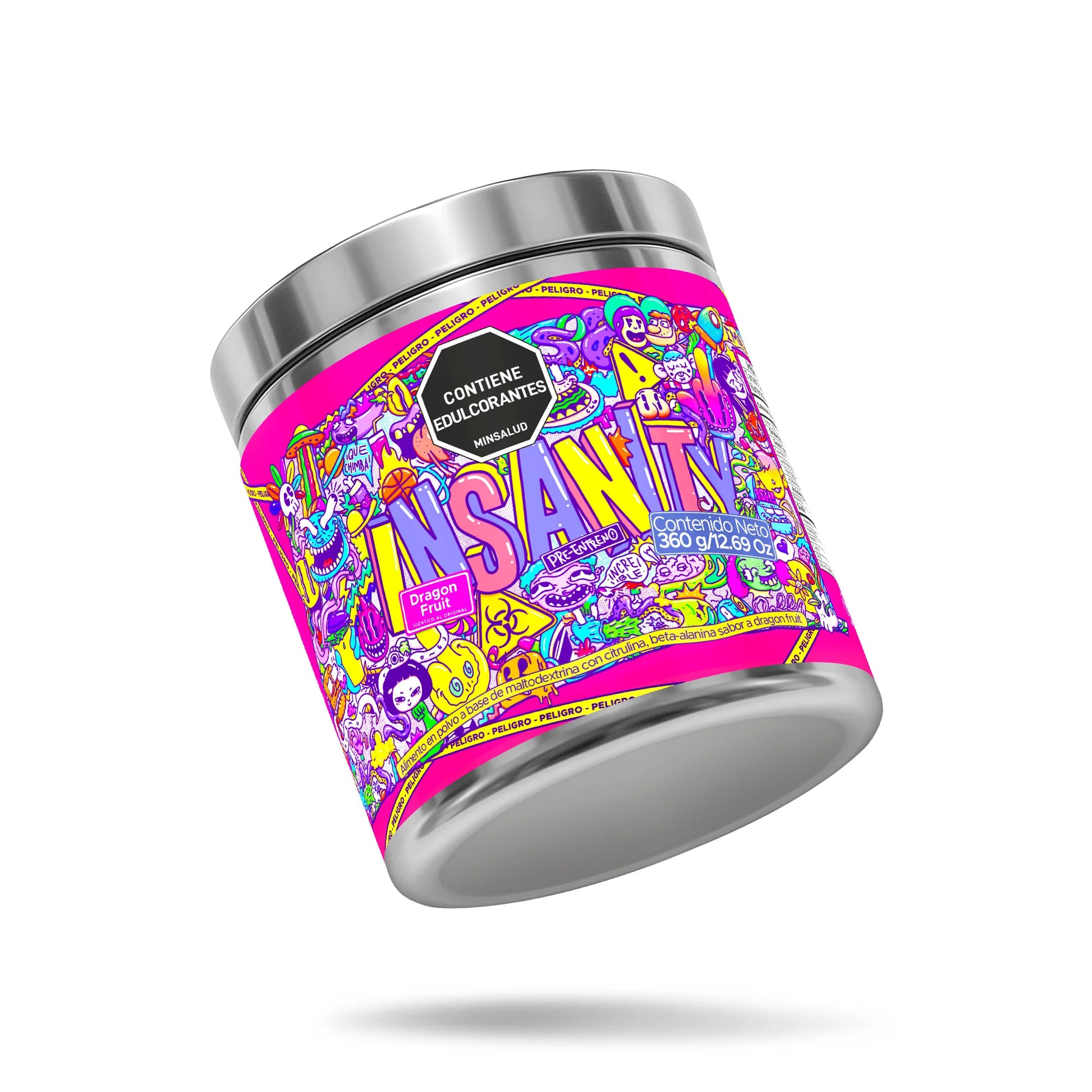 INSANITY es un alimento en polvo a base de maltodextrina con L-citrulina, L-beta-alanina, sabor a dragon fruit.