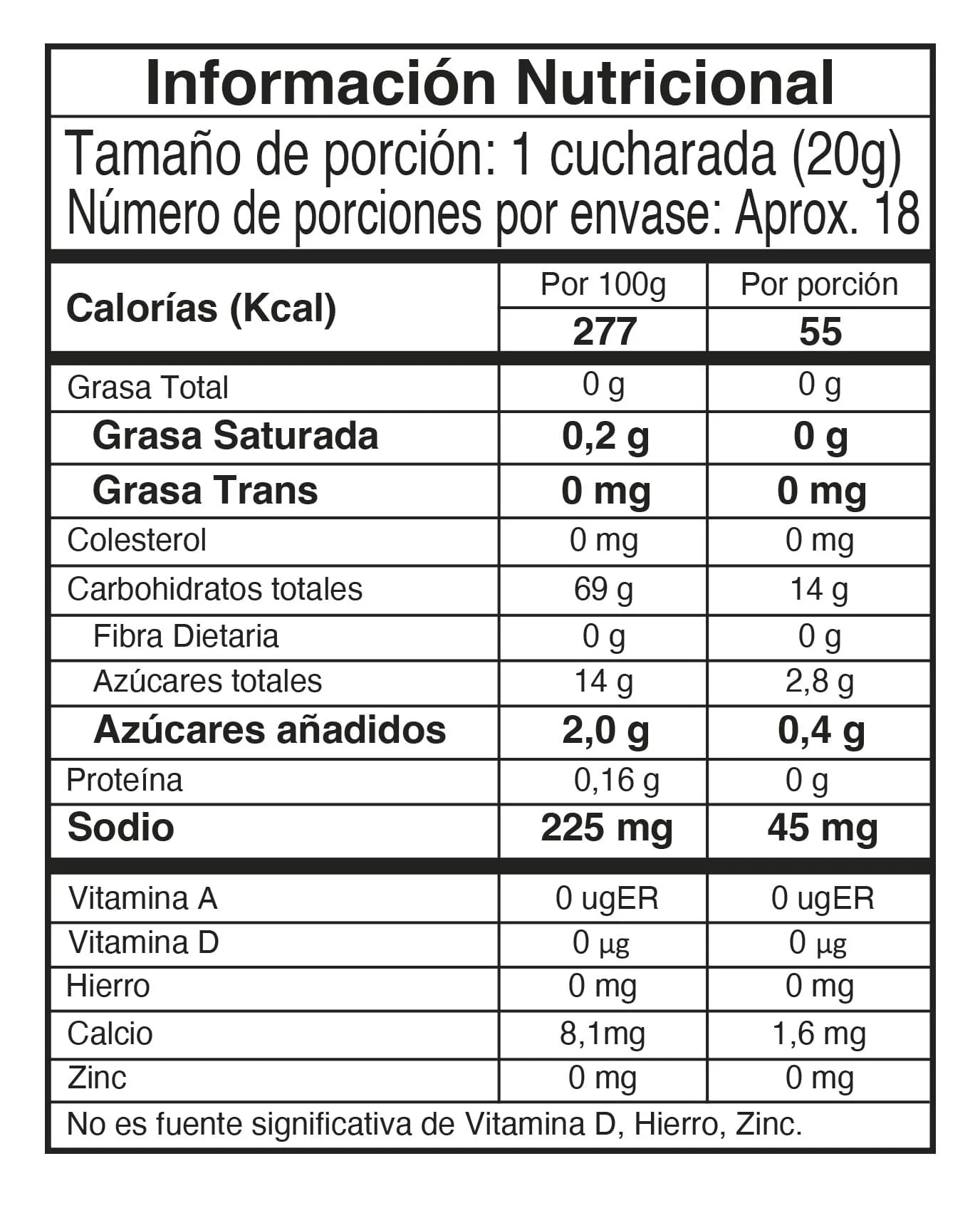 MODO DE CONSERVACIÓN: Manetener el empaque bien cerrado en un lugar seco, fresco y libre de olores que lo contaminen. No se recomienda dispensar con el scoop o manos húmedas. Una vez abierto el producto, consumir en el menor tiempo posible.