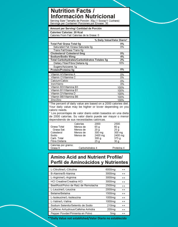 Ingredientes: Polvo Deshidratado De Frutos Rojos, L-Citrulina,Beta-Alanina, Creatina Hcl, Polvo De Raíz DeRemolacha, L-Leucina, L-Arginina, Betaina, L-Isoleucina, L-Valina, Dioxido De Silicio (Anticompactante), Cafeina, Sucralosa (Edulcorante), Saborizante Idéntico Al Natural, Goma Xanthan (Espesante), Citrato De Zinc, AcidoMalico (Acidulante), Niacina (Vitamina B3), Benzoato De Sodio (Conservante), Colorante Rojo, Pimienta En Polvo, Piridoxina Clorhidrato,TiaminaClorhidrato, Vitamina D3, Selenito De Sodio.