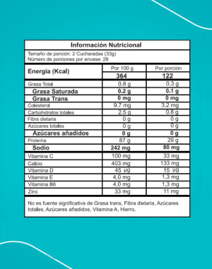 Ingredientes: Proteína Aislada de Suero de Leche, Sabor Idéntico al Natural (Vainilla Blanc), Carboximetilcelulosa CMC (Estabilizante), Lecitina de Soya (Estabilizante), Goma Xanthan (Espesante), Dióxido de Silicio (Anticompactante) (1000 mg/Kg), Citrato de Zinc, Vitamina C (Acido Ascórbico), Edulcorante Natural (Stevia), Vitamina B6 (Piridoxina), Vitamina E, Vitamina D; contiene: Leche y Soya.