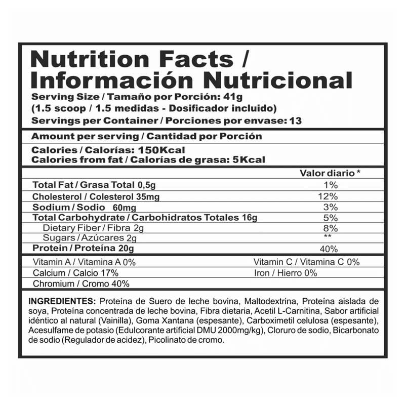 Megalite Zero %, combina en su fórmula por toma, el 50% de la recomendación diaria de proteína, obtenida de tres fuentes, con diferentes velocidades de absorción, buscando así lograr un mayor tiempo de saciedad. Contiene en su fórmula 1.000 mg L-Carnitina y 400 mcg Picolinato, aporta 20 gramos de proteína por servicio.PRESENTACION: 1.17 LBSABOR: Vainilla.