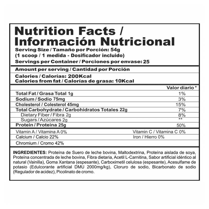 Megaplex Lite, combina en su fórmula por toma el 50% de la recomendación diaria de proteína, obtenida de tres fuentes con diferentes velocidades de absorción, buscando así lograr un mayor tiempo de saciedad. Contiene en su fórmula 1000mg de L-Carnitina y 400mcg de Picolinato de cromo, aporta 25 gramos de proteína por servicio.