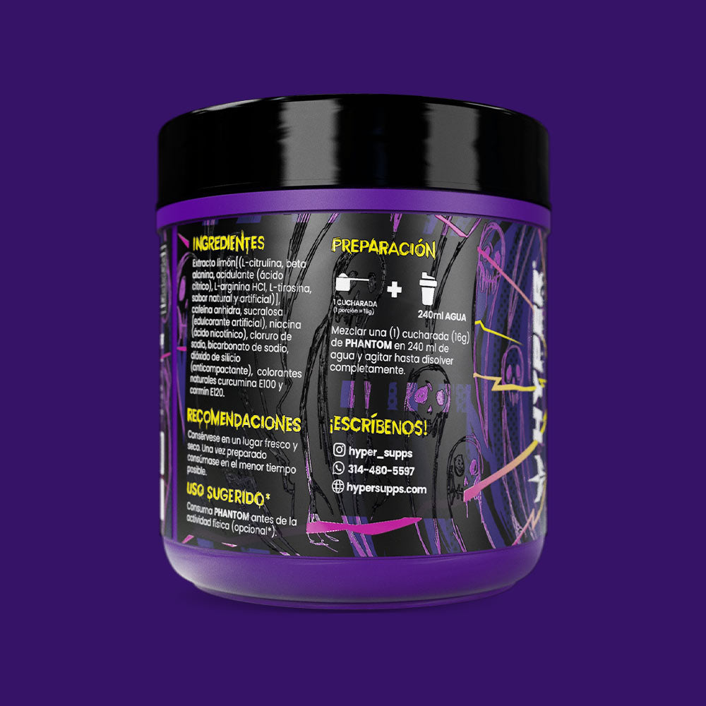 Phantom no es solo un pre entreno, es una revolución en tu rutina. Hemos creado una fórmula que desafía lo convencional, combinando la calidad clásica con un enfoque disruptivo y efectivo. Cada dosis de PHANTOM te ofrece una experiencia única: un sabor refrescante y delicioso a limonada de toronja, sin rellenos innecesarios como maltodextrina o polvo de frutas.