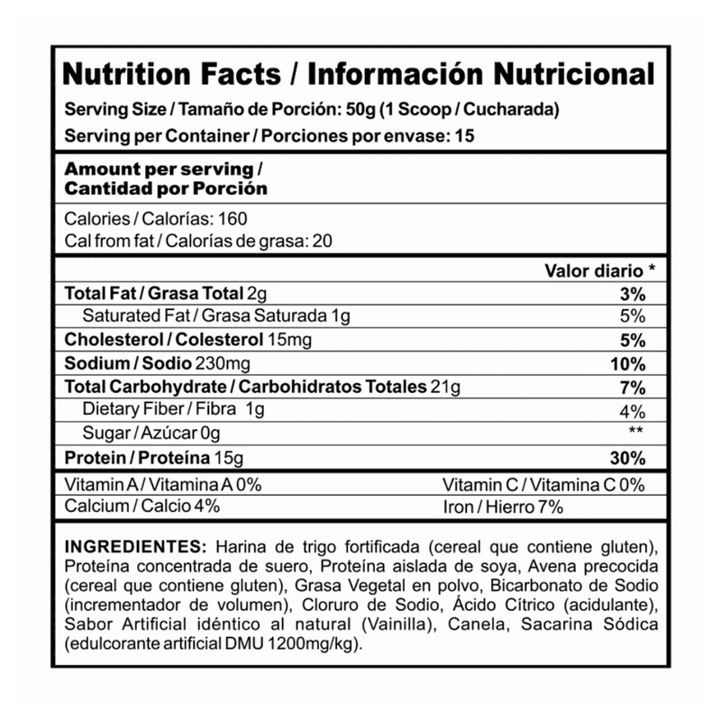 Mezcla para preparar pancakes y waffes de proteína en polvo 1.65 g. Aumento de masa muscular. 21 g por porción. Cero Azúcar. Contiene gluten. 160 Calorías. Registro Invima: RSA-0007766-2019 No aplica devolución por retracto al ser de uso personal. USO SUGERIDO: Mezcle Protein Pancake Tradicional 50 g (1 medidas/cucharadas) en 90 ml de agua o leche descremada. Consúmalo en el desayuno y/o como merienda en cualquier momento del día, prepare según las siguientes indicaciones: 1 En un recipiente deposite la mezcla y adicione 3/4 medidas de producto y 1/2 cucharada de agua, adicione 1 huevo entero. 2 Mezcle hasta homogeneizar. 3 Caliente un sartén antiadherente, deposite 1 cucharada de la mezcla anterior, dore por 1 minuto, voltee y deje por 20 segundos, 4 Puede acompañar a su gusto con fruta. Incluye medidor (cuchara dosificadora).