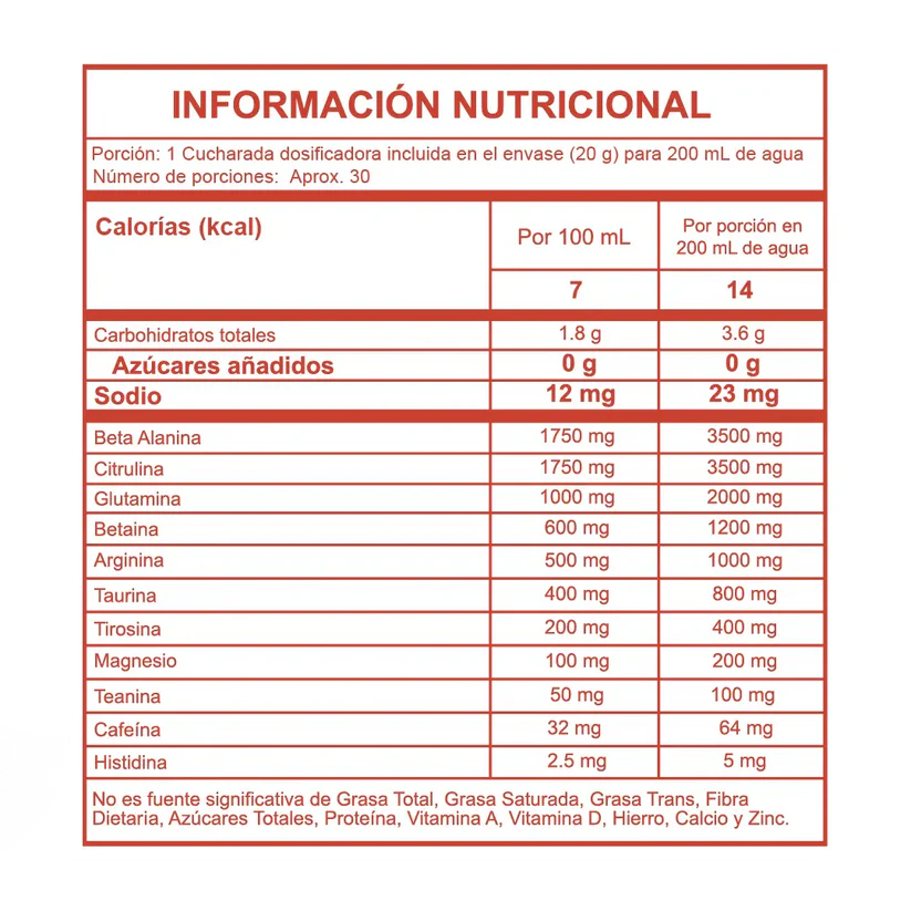 Alimento que contiene isomaltulosa, dextrosa, taurina, cafeína, aminoácidos (Beta alanina, citrulina, glutamina, arginina, citrato de magnesio, betaína HCL, histidina, taurina , teanina, cafeína ,tirosina), entre otros ingredientes.