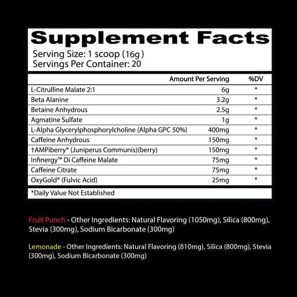 Hay 230 mg de cafeína activa en el producto derivada de 300 mg de ingredientes: 150 mg de cafeína anhidra: una forma deshidratada de cafeína para promover el estado de alerta y la vigilia, 75 mg de citrato de cafeína: una forma de cafeína de liberación rápida y 75 mg de malato de dicafeína: una forma de cafeína de liberación más lenta