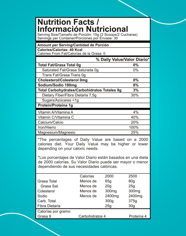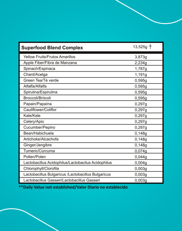 Ingredientes: Polvo Deshidratado De Frutos Amarillos, Fibra De Manzana, Espinaca En Polvo, Acelga E Polvo, Te Verde, Alfalfa En Polvo, Espirulina, Acido Citrico (Acidulante), Papaína En Polvo, Carboximetilcelulosa (CMC), Cliflor En Polvo, Kale En Polvo, Apio Molido, Pepino Cohombro, Saborizante Idéntico Al Natural (Lemon), Harina De Habichuela, Alcachofa En Polvo, Jengibre, Curcuma, Endulzante Artificial (Sucralosa), Cloruro De Calcio, Antioxidante (Ácido Ascórbico), Polen En Polvo, Cloruro De Sodio, Oxido De Magnesio, Dióxido De Silicio, Lactobacilus Acidopulus, Colorante Natural Clorofila), Lactobacilus Bulgaricus, Lactobacilus Gasseri.