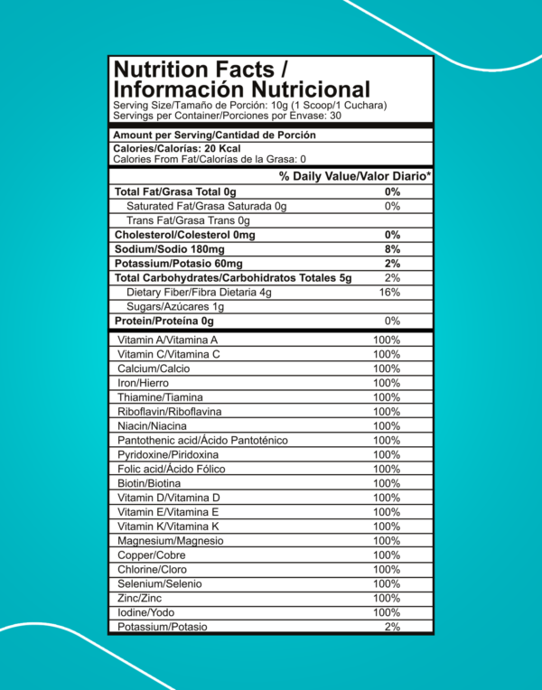 Ingredientes:Polvo Deshidratado de Frutos Amarillos, Citrato de Calcio, Acidulante (Ácido Málico), Saborizante Idéntico al Natural (Orange), Coenzima Q10, Endulzante Artificial (Sucralosa), Anti compactante (Dióxido De Silicio), Lecitina de Soya (Estabilizante), Vitamina C, Ácido R-Alfa Lipoico, Cloruro de Potasio, Citrato de Magnesio, Niacina, Fumarato Ferroso, Citrato de Zinc, Ácido Pantoténico, Betacaroteno, Cloruro de Sodio, Bioperina, Citrato de Boro, Cobre, Piridoxina Clorhidrato Riboflavina, Vitamina A Retinol Acetato, Tiamina, Vitamina D, Vitamina E, Biotina, Yoduro de Potasio, Selenito de Sodio, Vitamina K.
