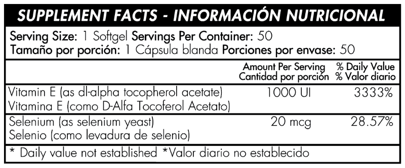 Vitamina E (D-Alfa Tocoferol Acetato), Selenio (como Levadura de Selenio al 10%). Adultos Solamente. Tomar una (1) Cápsula blanda al día con la comida principal. No tome este suplemento dentro de la hora siguiente al consumo de medicamentos. No exceder la porción recomendada.